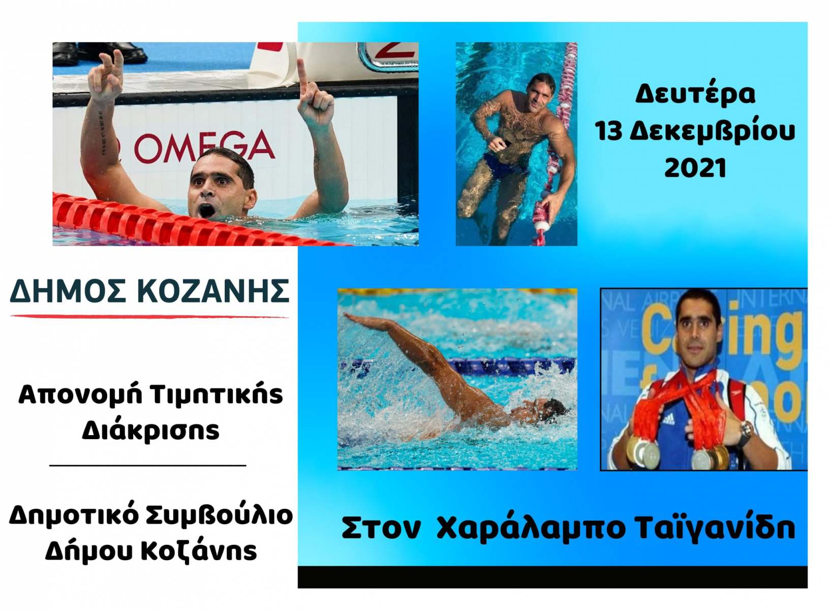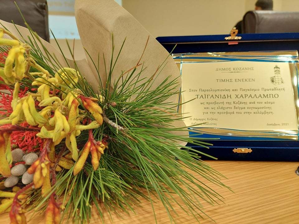 Σε μία συγκινητική εκδήλωση το Δημοτικό Συμβούλιο Κοζάνης τίμησε τον Παραολυμπιονίκη και Παγκόσμιο Πρωταθλητή, Χαράλαμπο Ταϊγανίδη, για την προσφορά του στην κολύμβηση, το απόγευμα της Δευτέρας