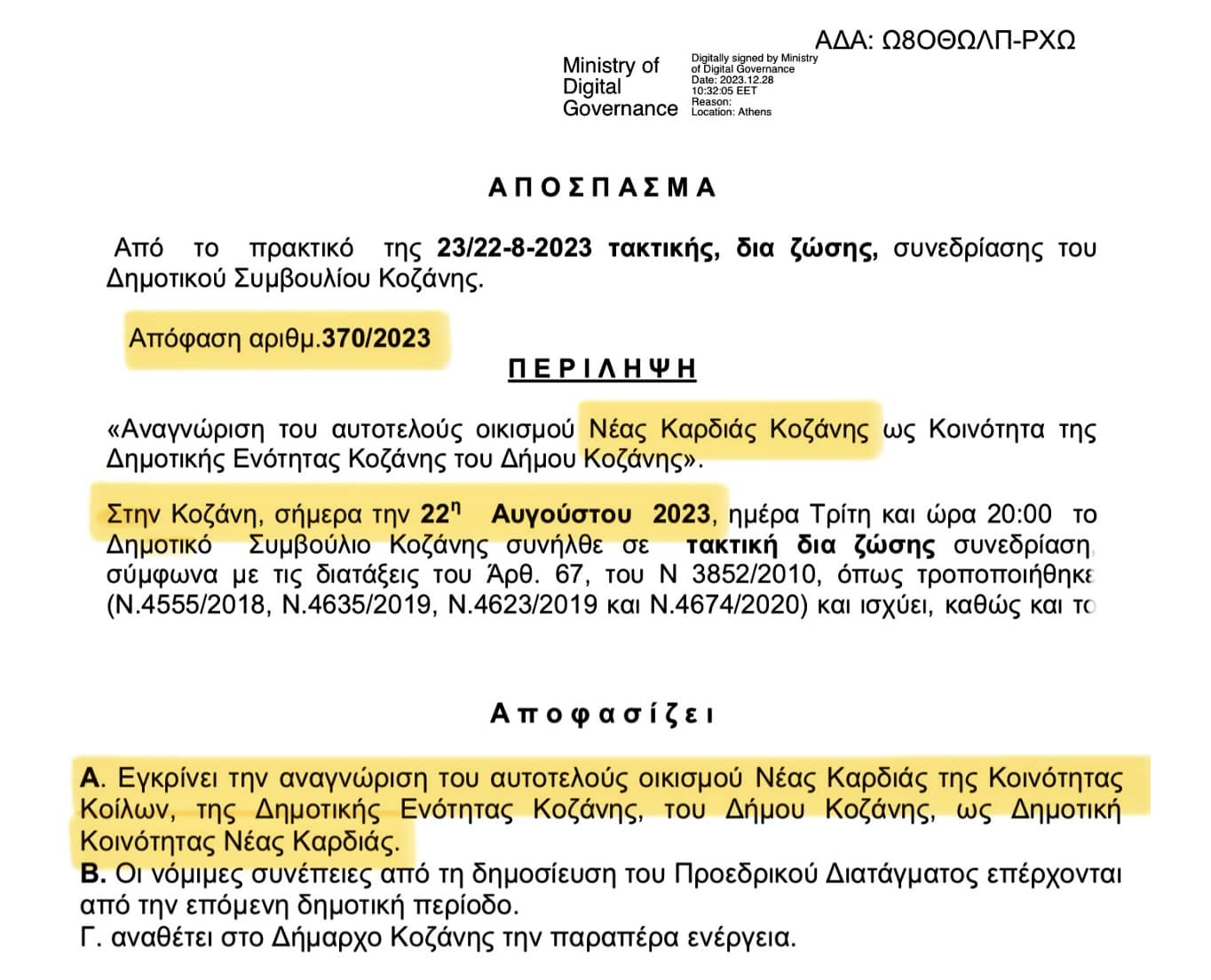 • στις 22/8/2023 το Δημοτικό Συμβούλιο με την 370/ 2023 απόφασή του εγκρίνει την αναγνώριση της Νέας Καρδιάς ως Κοινότητα !