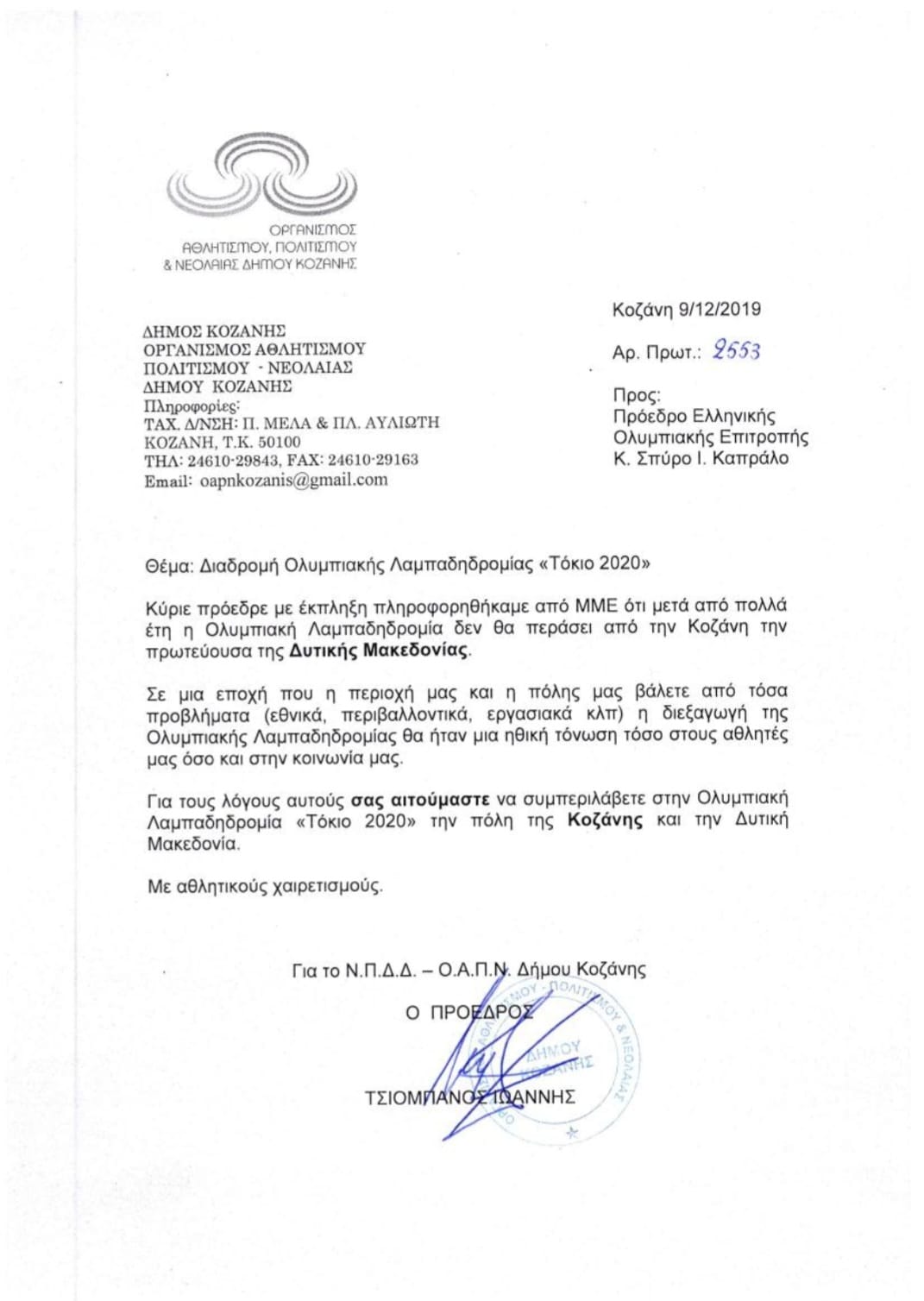 Ο αποκλεισμός μας από την πορεία της Φλόγας προς τους Ολυμπιακούς Αγώνες του Τόκιο,που διαδραματίστηκαν εντέλει το 2021 λόγω πανδημίας, μας ανάγκασε ως δημοτική αρχή τον Δεκέμβρη του 2019 να διαμαρτυρηθούμε προς τον πρόεδρο της Ολυμπιακής Επιτροπής με επιστολή του τότε προέδρου του ΟΑΠΝ του Δήμου Κοζάνης Γιάννη Τσιομπάνου.
